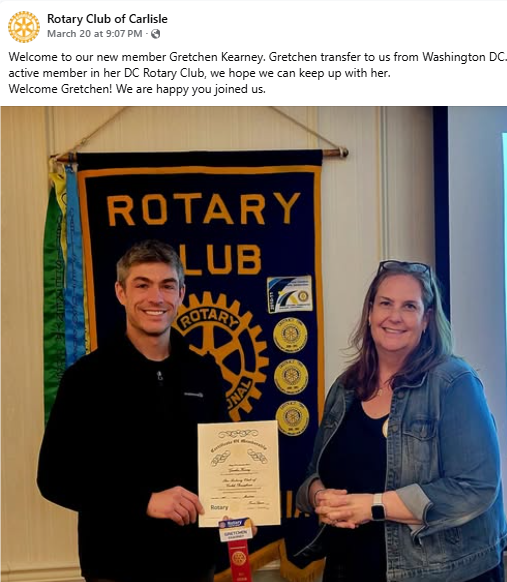 Congratulations to Carlisle Rotary member, Mary Brunski, on becoming our new District Governor! She is joined by Former DG Fred Gellert, Carlisle Sunrise.