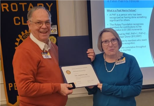 President Elect Deborah Sweaney receives her Paul Harris Fellowship Award from Foundation Chair Ron Greenway.